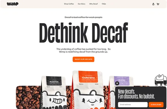 The idea behind Wimp is that decaf coffee shouldn’t be the poor relation. A simple, modern aesthetic provides the backdrop to engaging copy that feels personal and creates a connection with the user. But sadly not if the user is Ron Swanson.