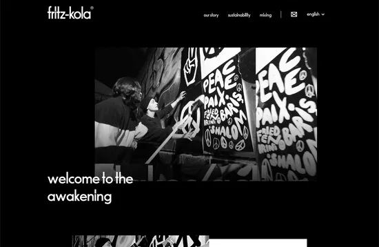 fritz-kola has gone for a youthful, punchy look, with crisp bold white type on black. Images and videos are greyscale except for the products that stand out as the only color.