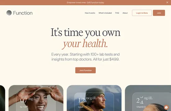 Function Health’s site uses selective interactive highlighting break up a dense block of text. This together with app-style images and engaging animated illustration helps to demystify and humanize the medical terminology.