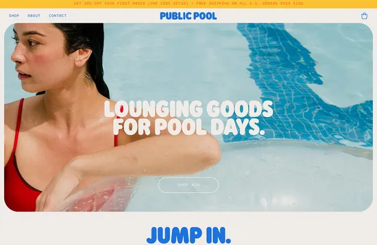 The bright blue and soft yellow palette, the rounded and irregular shapes, and the inflatable display type all combine here to create the feeling of being poolside in the sun.
