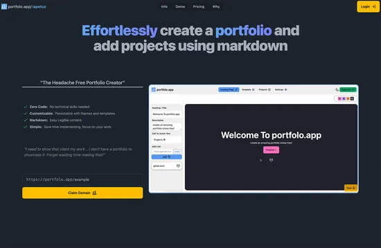 Portfolo lets you create an online showcase for your work, using markdown. It’s simple and fast, allowing you to focus on the work you want to show.