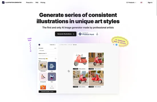 This AI image generator from Icons8 has been trained on the illustrations created by Icons8’s own team of artists. You can get a set of consistent images, with no legal or ethical issues.