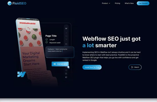 FluidSEO is an SEO plugin for Webflow. As well as the usual SEO help such as page audits, Fluid SEO can implement changes and suggestions for you, and run tasks in bulk.