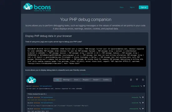 bcons is a php console that is added to your browser devtools. Inspect variable values, errors, and warnings without wading through error logs and var dumps. It currently works with Chromium and mozilla browsers.