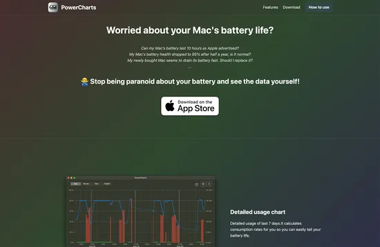 PowerCharts records your Mac’s battery health and performance and visualizes it in easy-to-read charts. Taking control of battery levels, consumption rates, maximum capacity, and level distribution over time may help you improve the battery life.