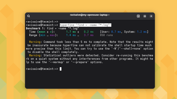 Benchmark 1: find ~ -name "*.log" Time (mean ± σ): 143.2 ms ± 8.4 ms [User: 62.1 ms, Sys: 80.7 ms] Range (min … max): 133.5 ms … 161.3 ms 10 runs
