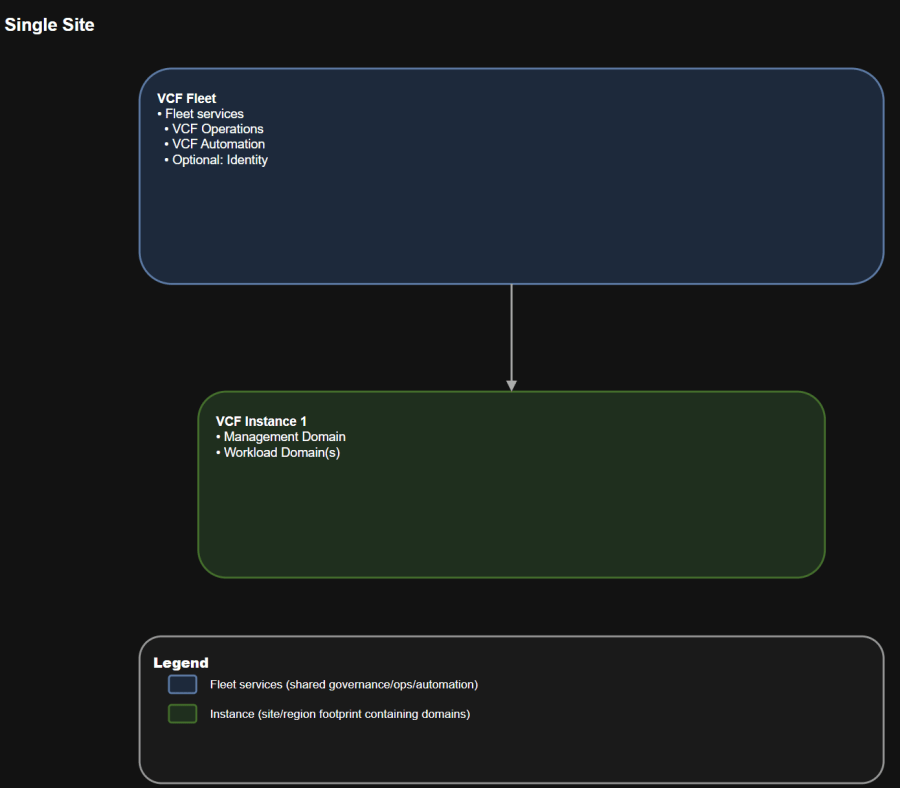 - Instance: a discrete VCF deployment footprint. Each instance contains its own management domain and workload domains.