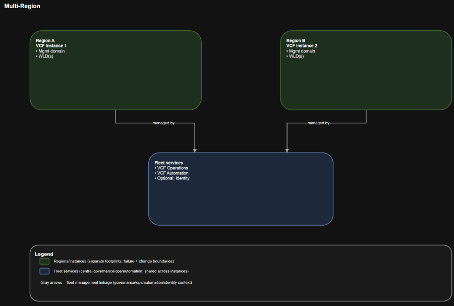 VCF 9.0 GA becomes easier to design and operate when you treat fleet, instance, and domain as explicit boundaries and then map them to site and region realities. Pick the simplest topology that meets your availability and isolation goals, and invest early in day-2 practices for identity, backups, lifecycle, and change control.