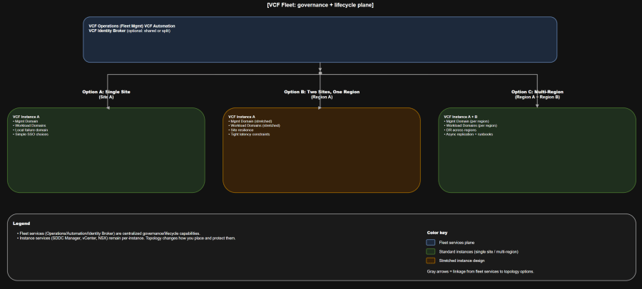 VCF 9.0 becomes dramatically easier to operate when you explicitly separate topology decisions (site, region, instance placement) from governance decisions (fleet services) and then choose identity boundaries that match your isolation and resilience goals. Once you standardize these mental models, your teams can scale the platform without scaling confusion.