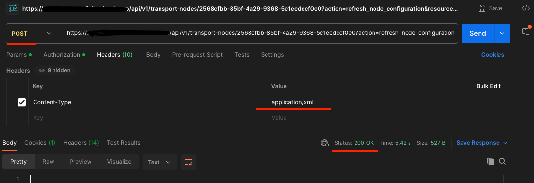 However, before proceeding with such actions, attempt to resolve the issue by refreshing the node configuration (refresh_node_configuration) using the POST API command. Be sure to add the NSX admin user account for authorization and set the content type to ‘application/xml’: