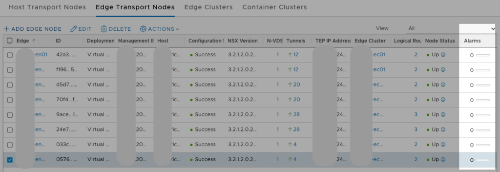Edge Alarms are displayed in System – Nodes – Edge Transport Nodes page.
