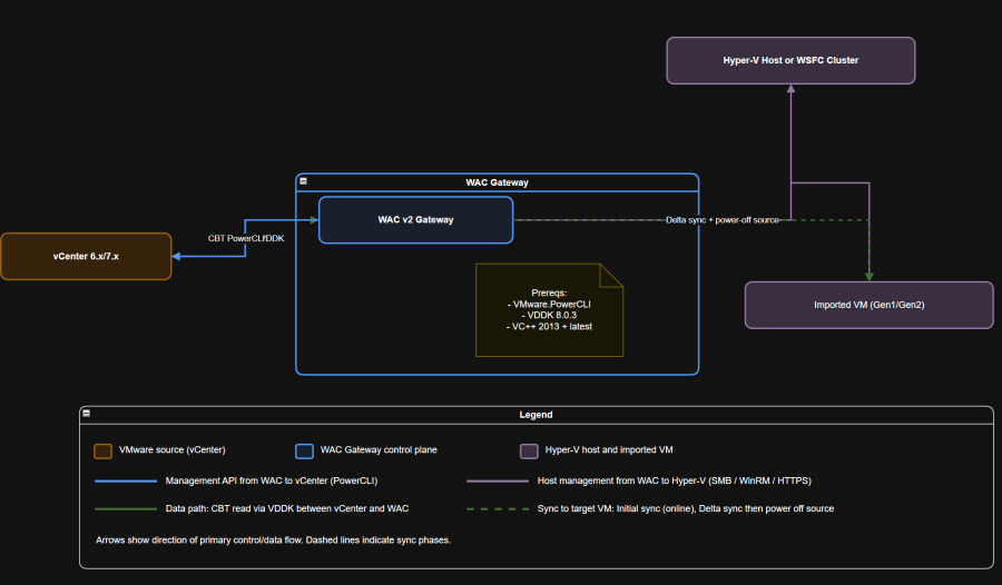 Flow: vCenter → VDDK and PowerCLI on WAC gateway → Hyper-V host or cluster (VHDX) → import VM → post-cutover cleanup.
